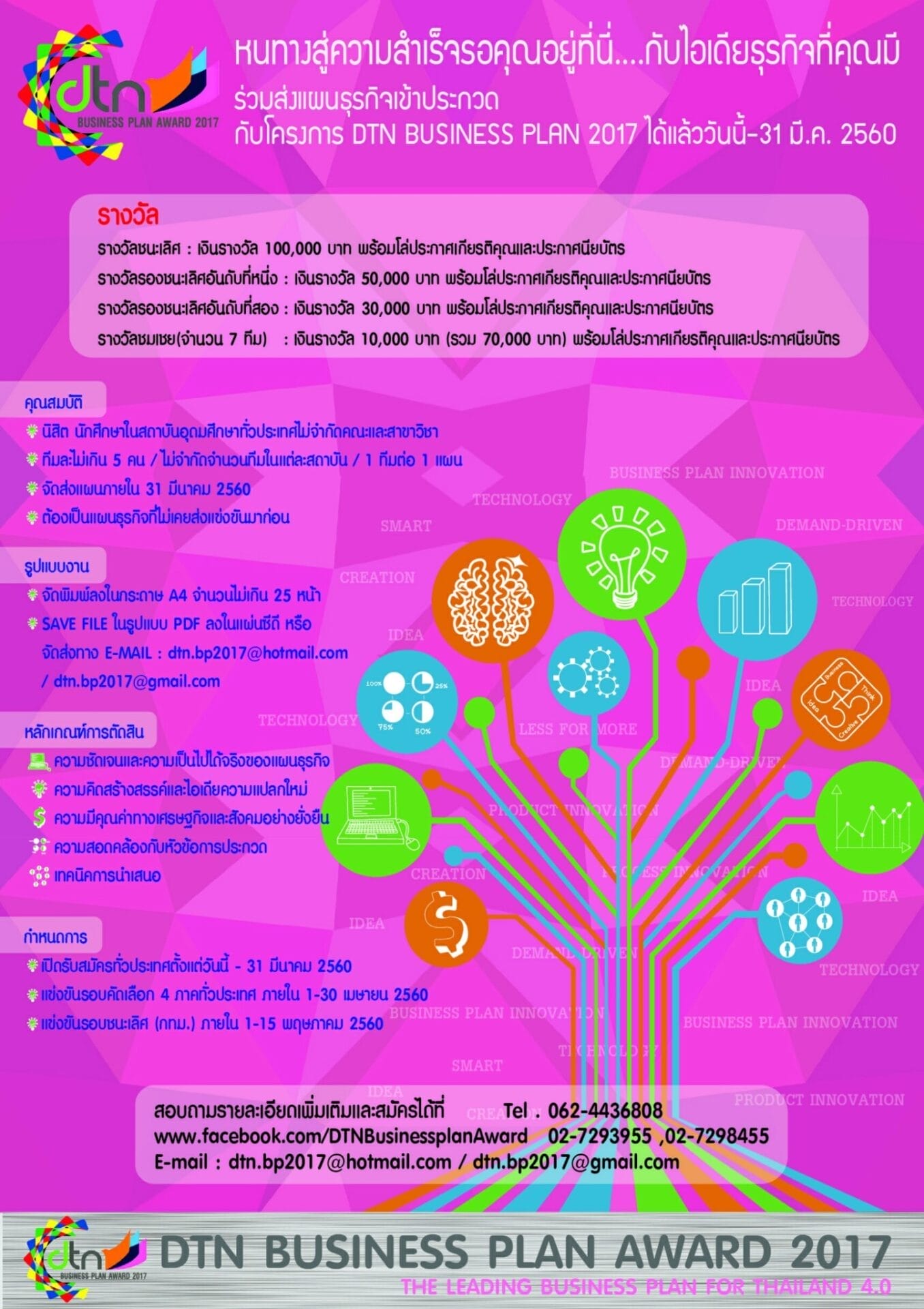 สนใจสอบถามรายละเอียดเพิ่มเติมติดต่อศูนย์ประสานงานกลาง DTN BUSINESS PLAN 2017 โทร. 062-443-6808, 02-729-3955, 02-729-8455/ www.facebook.com/DTNBusinessplanAward