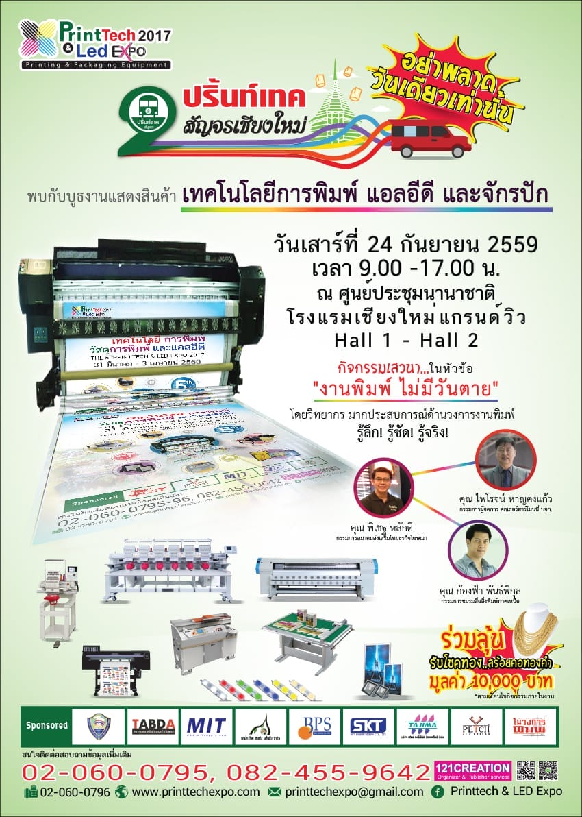 งานปริ้นเทคสัญจร ครั้งที่ 2 วันที่ 24 กันยายน 2559 สถานที่จัดงานศูนย์ประชุมนานาชาติ เชียงใหม่แกรน์วิว พบกับบูธสินค้าจากผู้นำเข้าเครื่องพิมพ์อิงค์เจ็ท, มัลติฟังค์ชั่น และอุปกรณ์ก่อนและหลังการพิมพ์สำหรับศูนย์ถ่ายเอกสารครบวงจร และสินค้าอื่นๆ อีกมากมาย กิจกรรมเสวนา ในหัวข้อ “งานพิมพ์ ไม่มีวันตาย” และ “การปรับตัว งานพิมพ์ และ สื่อนอกบ้านในยุคดิจิตอล โดยวิทยากร มากประสบการณ์ด้านวงการงานพิมพ์ คุณไนโรจน์ หาญคงแก้ว (กรรมการผู้จัดการ คัลเลอร์ฮาร์โมนนี่ บจก.), คุณพิเชฐ หลักดี (กรรมการสมาคมส่งเสริมไทยธุรกิจโฆษณา), คุณก้องฟ้า พันธ์พอกุล(กรรมการชมรมสิ่งพิมพ์ภาคเหนือ) และ Work Shop อาชีพเสริมจากผู้เชี่ยวชาญที่มีประสบการณ์โดยตรง ผู้ลงทะเบียนเข้าร่วมฟังการเสวนา ร่วมลุ้นรับโชคสร้อยคอทองคำ มูลค่า 10,000 บาท