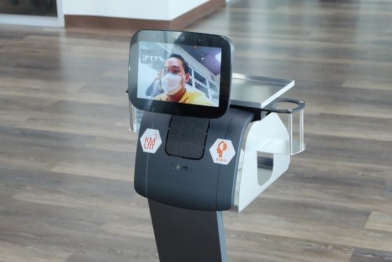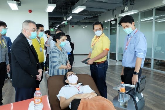 2) SOFA หุ่นยนต์บริการที่ติดตั้งจอแสดงผลที่สามารถแสดงข้อมูลการรักษาหรือผลการตรวจที่เชื่อมโยงข้อมูลกับระบบของโรงพยาบาล โดยแพทย์สามารถควบคุมทางไกลจากห้องควบคุมส่วนกลางให้หุ่นยนต์เคลื่อนที่ไปยังตำแหน่งเป้าหมาย มีกล้องถ่ายความร้อน (Thermal Camera) เพื่อจับอุณหภูมิร่างกาย กล้องความละเอียดสูงที่สามารถขยายได้ถึง 20 เท่า ช่วยให้แพทย์สามารถตรวจอาการจากสภาพภายนอกของผู้ป่วย อาทิ ตา ลิ้น ได้จากระยะไกล รวมถึงสามารถสนทนาโต้ตอบกับผู้ป่วยได้แบบวิดีโอคอล