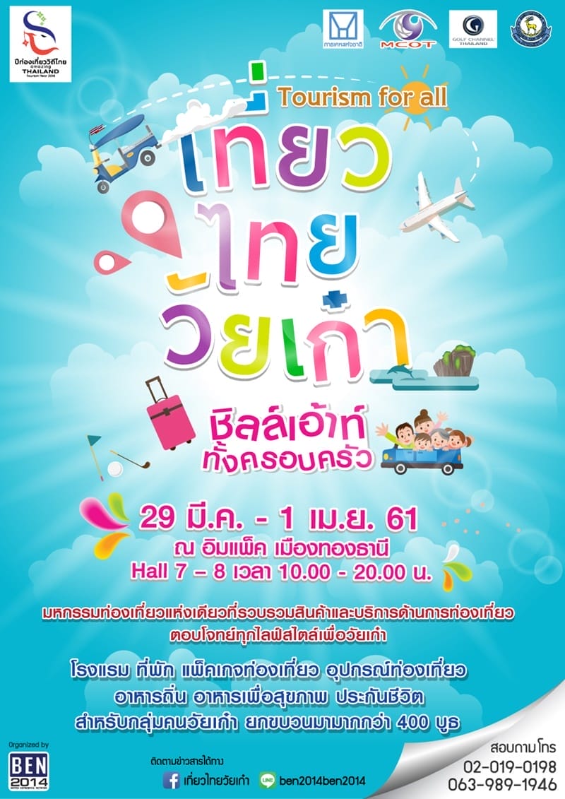 บริษัท เบน2014 ร่วมกับ การท่องเที่ยวแห่งประเทศไทย (ททท) เชิญชวนร่วมงาน “เที่ยวไทยวัยเก๋า ชิลเอาท์ทั้งครอบครัว” ในวันที่ 29 มีนาคม – 1 เมษายน 2561 ที่อาคารแสดงสินค้า อิมแพคเมืองทอง อาคาร 7 – 8 ตั้งเป้าสร้างรายได้เข้าประเทศเพิ่มขึ้น 10% ภายในงาน ตอบรับความพร้อมการท่องเที่ยวของผู้สูงอายุ ซึ่งเป็นกลุ่มคนที่มีกำลังในการท่องเที่ยวสูง ไม่มีภาระด้านการทำงานและครอบครัว มีเงินสะสมจากการทำงาน หรือได้สวัสดิการของรัฐมา ที่ต้องการพักผ่อนและท่องเที่ยวเพื่อหากำไรชีวิต และการเดินทางในแต่ละครั้งยังมีผู้ติดตาม 1-2 คน จึงเป็นกลุ่มที่มีกำลังซื้อและน่าสนใจ โดยส่วนใหญ่นักท่องเที่ยวกลุ่มนี้จะมีระยะเวลาพำนักเฉลี่ย 10.72 วันต่อครั้ง นานกว่านักท่องเที่ยวโดยรวม 1.25 วัน ประเทศไทย ถือเป็นประเทศที่อยู่ในความนิยมอันดับต้นๆ ของผู้สูงอายุทั่วโลกที่นิยมเดินทางมาท่องเที่ยวและใช้ชีวิต สอดคล้องกับข้อมูล Retirement Index 2016 โดย International Living ระบุว่า ประเทศไทยติดอันดับที่ 7 จาก 43 ประเทศของประเทศที่ผู้เกษียณอายุนิยมไปใช้ชีวิตมากที่สุด ทั้งยังเป็นอันดับ 1 ใน 2 ของประเทศของภูมิภาคเอเชียที่เป็นเป้าหมายสูงสุด 10 อันดับแรกของผู้เกษียณอายุที่นิยมไปใช้ชีวิตมากที่สุด (อีกหนึ่งประเทศ