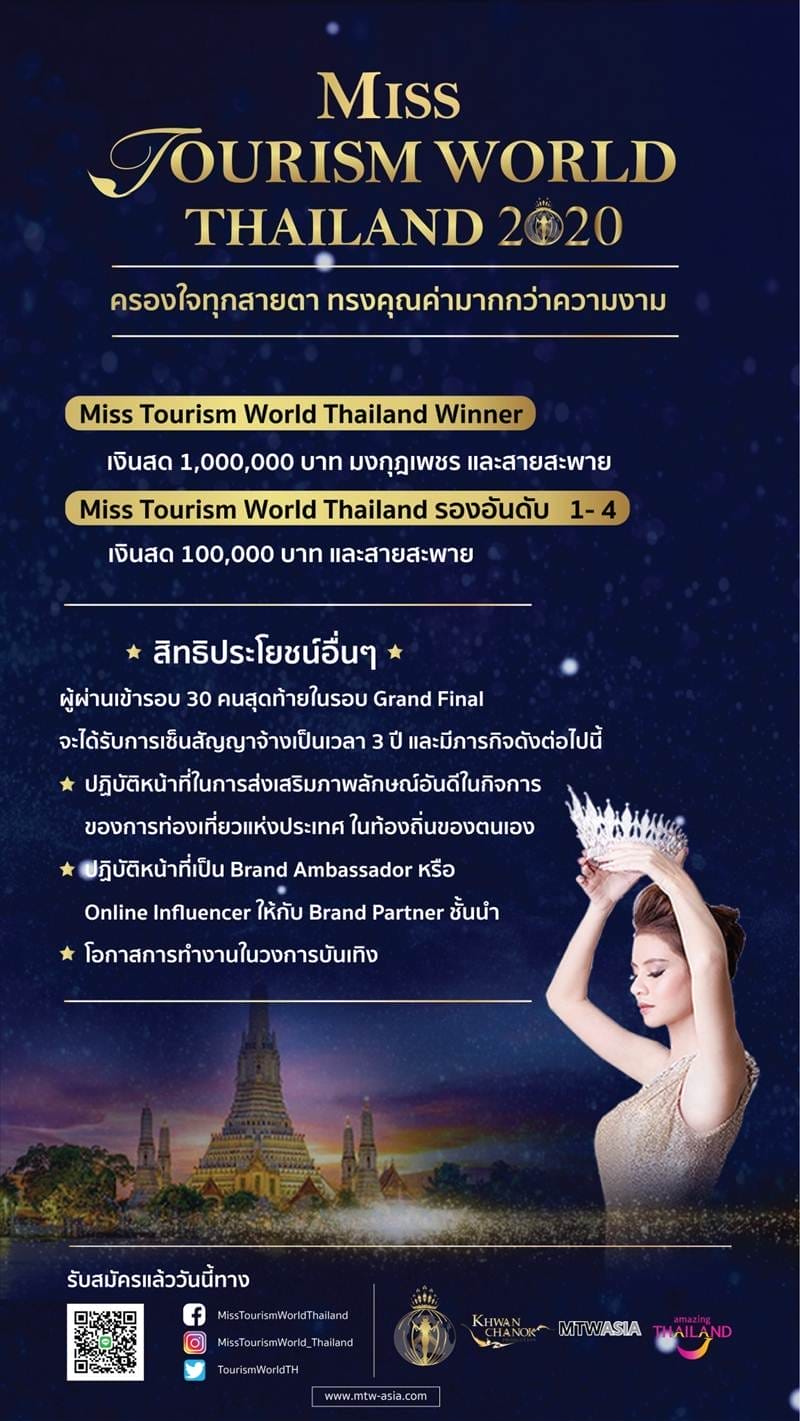 ปรากฏการณ์ครั้งใหม่ที่จะสร้างผู้ครองมงกุฎที่สวยด้วยความสามารถ โอกาสของการก้าวเข้าสู่เส้นทางการเป็นทูตการท่องเที่ยวประเทศไทย และการเป็นผู้ทรงอิทธิพลบนโลกออนไลน์กำลังจะเกิดขึ้นอีกครั้ง กับการประกวด Miss Tourism World Thailand 2020 เวทีที่เฟ้นหาตัวแทนของผู้หญิงยุคใหม่ที่ครองใจทุกสายตา ทรงคุณค่ามากกว่าความงาม มีบุคลิกดี มั่นใจในตัวเอง มีความสามารถ อายุตั้งแต่ 18 – 28 ปี พร้อมแนวคิดที่ฉีกทุกกฎของเวทีการประกวดด้วยการไม่จำกัดส่วนสูง รูปร่าง และเคยผ่านเวทีประกวดใดมาก่อนก็ได้ โดยผู้ชนะจะได้รับมงกุฎเพชร สายสะพาย และรางวัลอื่นๆ รวมมูลค่า 1 ล้านบาท และผู้ผ่านเข้ารอบ 30 คนสุดท้ายจะมีโอกาสต่อยอดเป็นศิลปิน และ แบรนด์ Influencer กับทางบริษัทฯ ผู้สนใจสามารถกรอกแบบฟอร์มใบสมัครออนไลน์เพื่อเข้าร่วมการประกวดได้ตั้งแต่วันนี้ จนถึงวันที่ 20 มิถุนายน 2563 ทาง www.mtw-asia.com