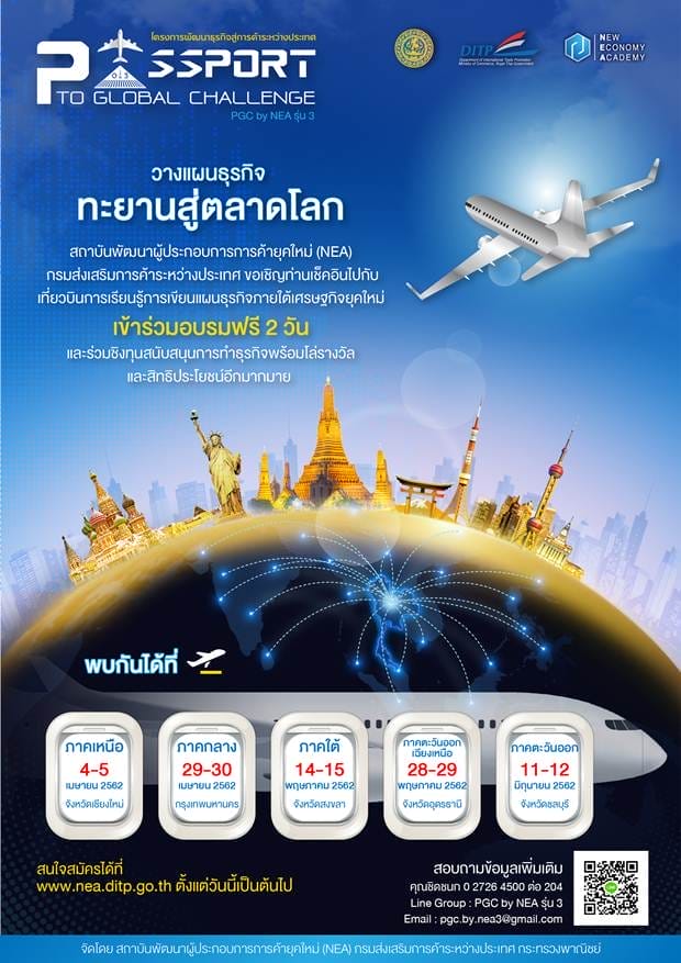 ซึ่งโครงการพัฒนาธุรกิจสู่การค้าระหว่างประเทศ (Passport to Global Challenge : PGC by NEA) รุ่น ๓ สถานบันพัฒนาผู้ประกอบการการค้ายุคใหม่ (NEA) กรมส่งเสริมการค้าระหว่างประเทศ จัดกิจกรรมอบรม/สัมมนา/เสวนา/ให้คาปรึกษา โดยมีรายระเอียดการดาเนินการ ๒ ช่วง ดังนี้