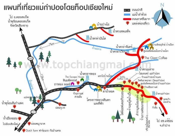 แผนที่เที่ยวหมู่บ้านแม่กำปองนี้ ท๊อปเชียงใหม่ ต้องการแสดงให้เห็นแหล่งท่องเที่ยวหลักๆ ที่น่าสนใจ ตามที่มีโอกาสได้ไปเจอมาครับ เผื่อมีใครอยากไปจะได้วางแผนกันครับ ตลอดเส้นทางที่ขับรถไปยังหมู่บ้านแม่กำปอง ผมก็เปิดกระจกรถรับลมเย็นๆ สบายๆ ขับไปเรื่อยๆ ท่ามกลางต้นไม้ใหญ่เขียวขจี ที่ปกคลุมถนนเอาไว้ แต่ก็ต้องระมัดระวังเป็นพิเศษ เพราะถนนค่อนข้างแคบและมีโค้งอยู่ตลอดทาง