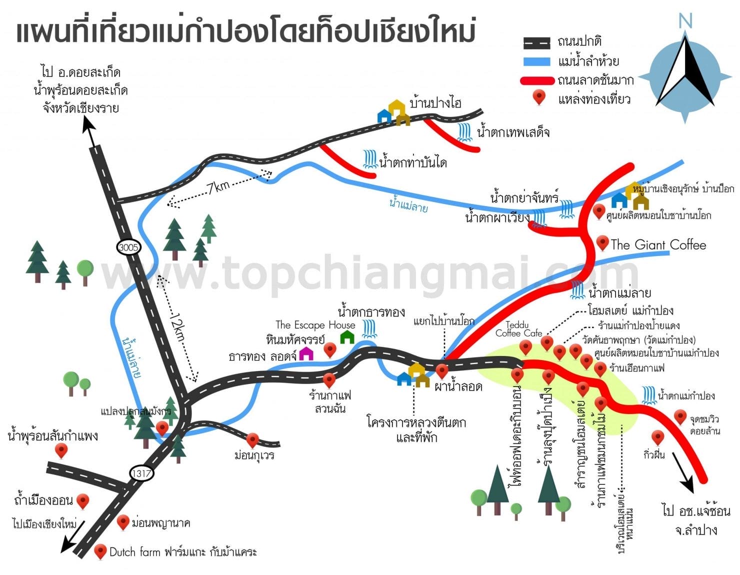ลองดูกันครับว่า จากแผนที่มีอะไรน่าสนใจบ้าง โดยท็อปเชียงใหม่ เดินทางมาจากตัวเมืองเชียงใหม่ ถนน1317 เพื่อที่จะไปหมู่บ้านแม่กำปอง ผ่านถ้ำเมืองออน และผ่านแยกเข้าน้ำพุร้อน ก่อนถึงแยกไปแม่กำปอง จุดนี้เป็นแหล่งขายต้นไม้ทั้งสองข้างทาง แหล่งท่องเที่ยวสำคัญๆ ตามเส้นทาง ก็มีดังนี้ครับ
