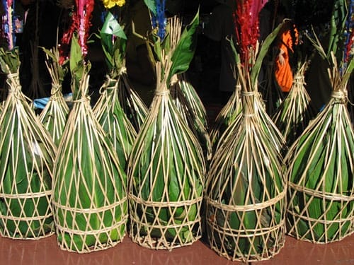 ก๋วยสลาก สานจากไม้ไผ่เป็นรูปทรงกระบอก (ชะลอม) ข้างในกรุด้านข้างด้วยใบตอง สำหรับบรรจุข้าวสาร อาหารแห้ง ผลหมากรากไม้ ของใช้จำเป็น ดอกไม้ธูปเทียน โดยชาวบ้านจะนำก๋วยสลากของแต่ละคนไปรวมกันที่วัดเพื่อทำพิธีทางศาสนา
