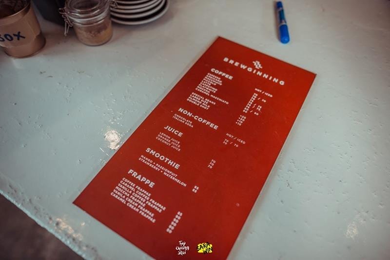 เมนูในร้าน BREWGINNING ก็มีจะเค้กขนม กาแฟปั่น กาแฟร้อน-เย็น น้ำผลไม้ ราคามีตั้งแต่ 55-80 บาท