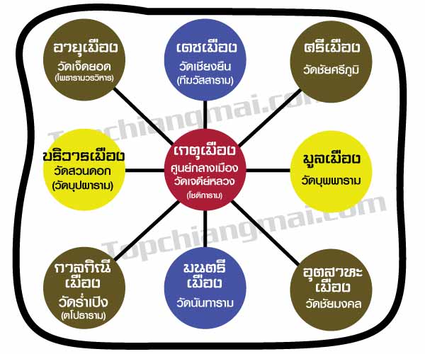 สำหรับแนวคิดในเรื่องวัดทักษาเมืองนั้นเกิดขึ้นในสมัยพระเจ้าติโลกราช โดยการย้ายและสร้างศูนย์กลางเมืองมาที่ใหม่คือ พระธาตุเจดีย์หลวง โดยการเปลียนฐานะจาก กู่ สถูปบรรจุอัฐิพระเจ้ากือนา มาเป็นเจดีย์บรรจุพระบรมสารีริกธาตุพร้อมทั้งสถาปนาวัดเจดีย์หลวงเป็นเกตุเมือง และทรงอัญเชิญพระแก้วมรกตมาประดิษฐานที่องค์พระเจดีย์ อีกทั่งให้หมื่นด้ามพร้าคต เสริมสร้างความใหญ่โตและแข็งแรงให้แก่องค์พระเจดีย์เพื่อให้เป็นมิ่งขวัญเมือง พร้อมทั้งสถาปนาวัด 8 วัดซ้อนทักษาเมืองเดิม ซึ่งประกอบด้วย
